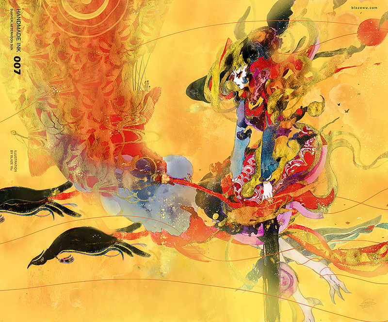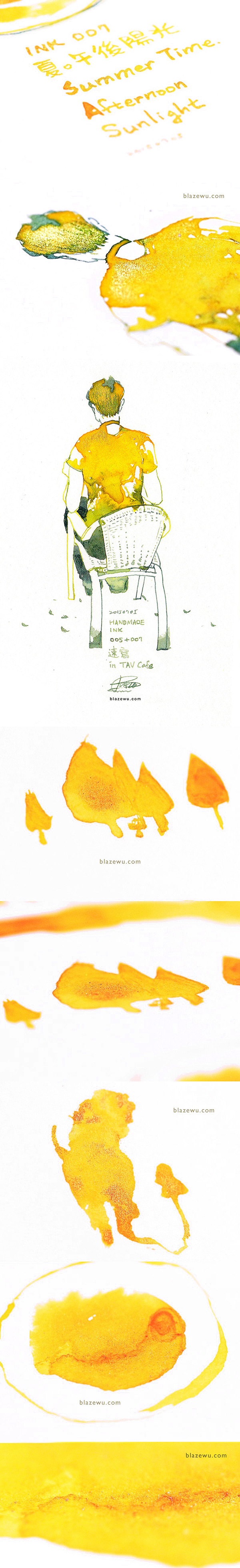 這款黃色很適合拿來畫食物,像是荷包蛋、鬆餅、麵包之類烤的很好吃的那種。也可以拿去跟其他墨水在紙上相遇,很容易就可以玩出不錯的層次感。