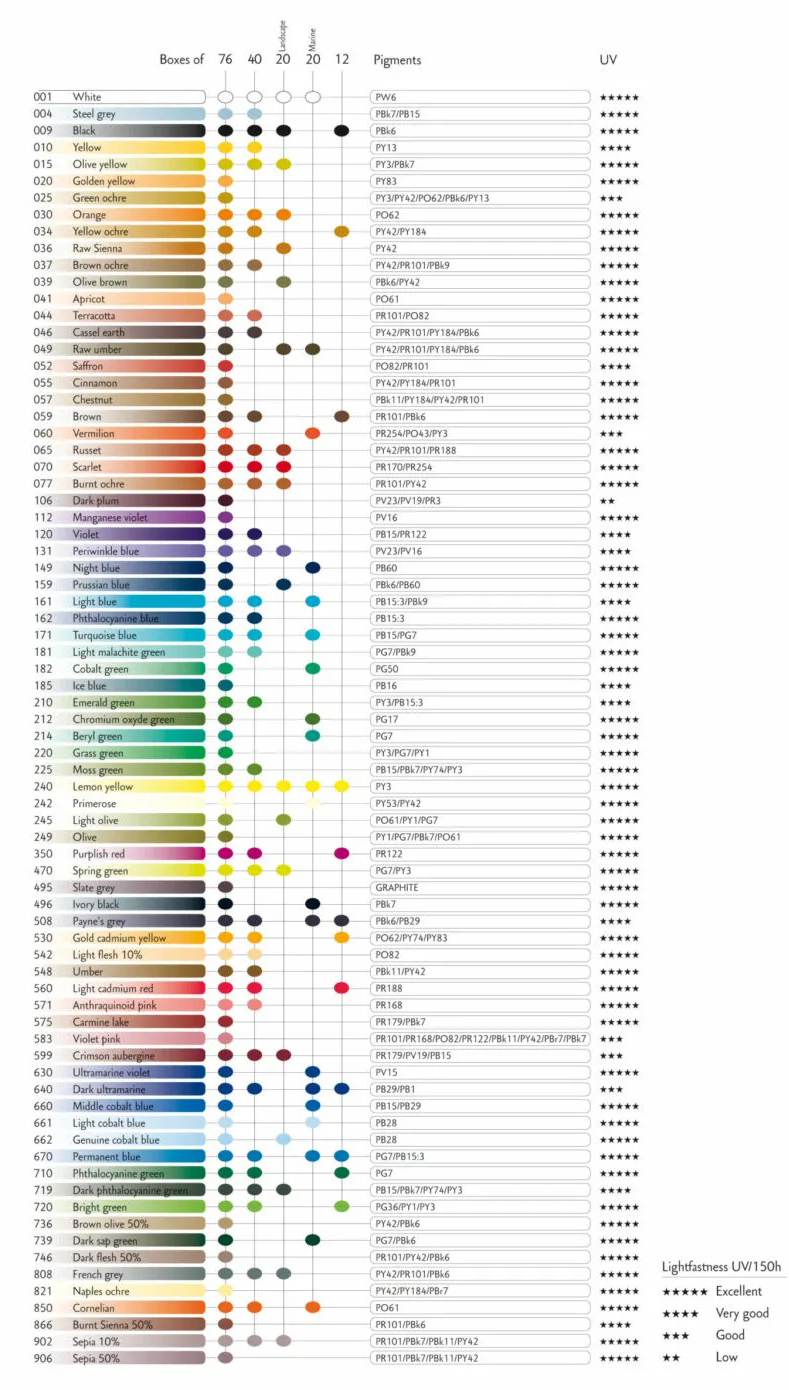 由六種高純度的單原色顏料調配出濃度極高的水溶性色鉛筆,每個顏色都有著博物館認證級的耐光性以及卓越的溶解性,呈現出鮮豔飽和高亮度的色彩。