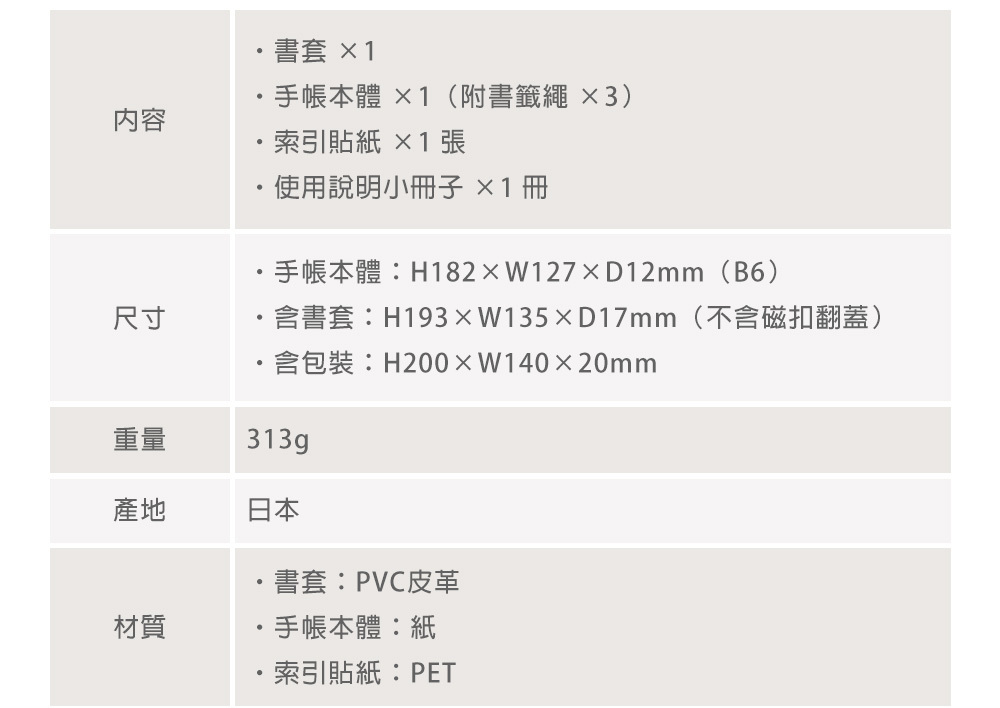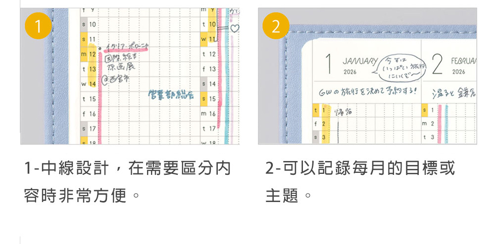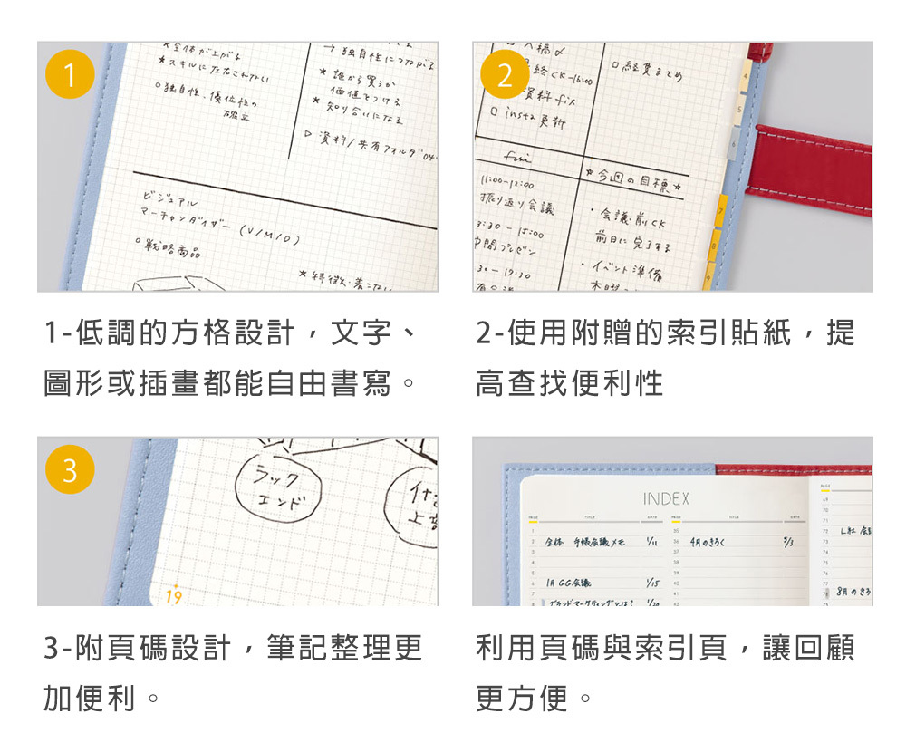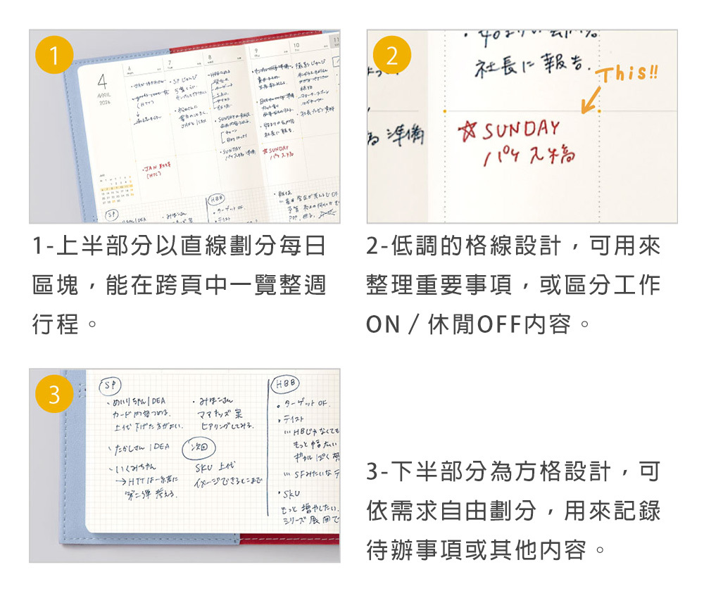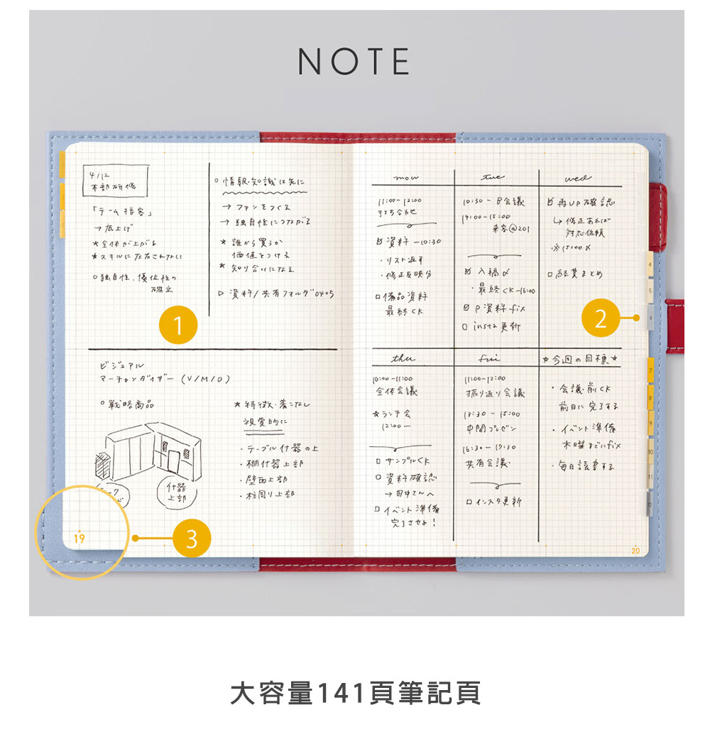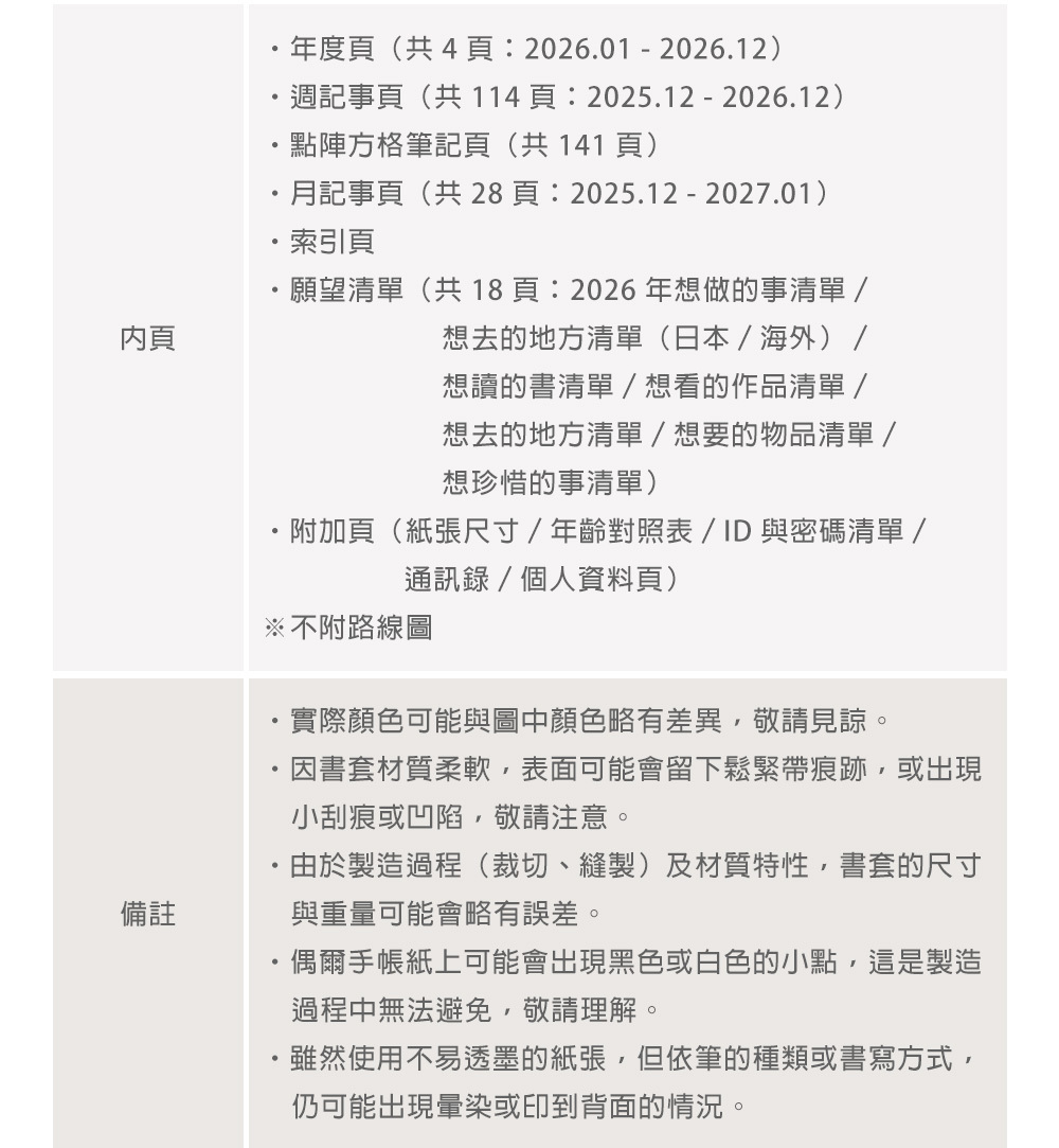 年曆(4 頁)、月計畫(28頁)、週計畫(114頁)、點陣筆記頁(141頁)、附錄