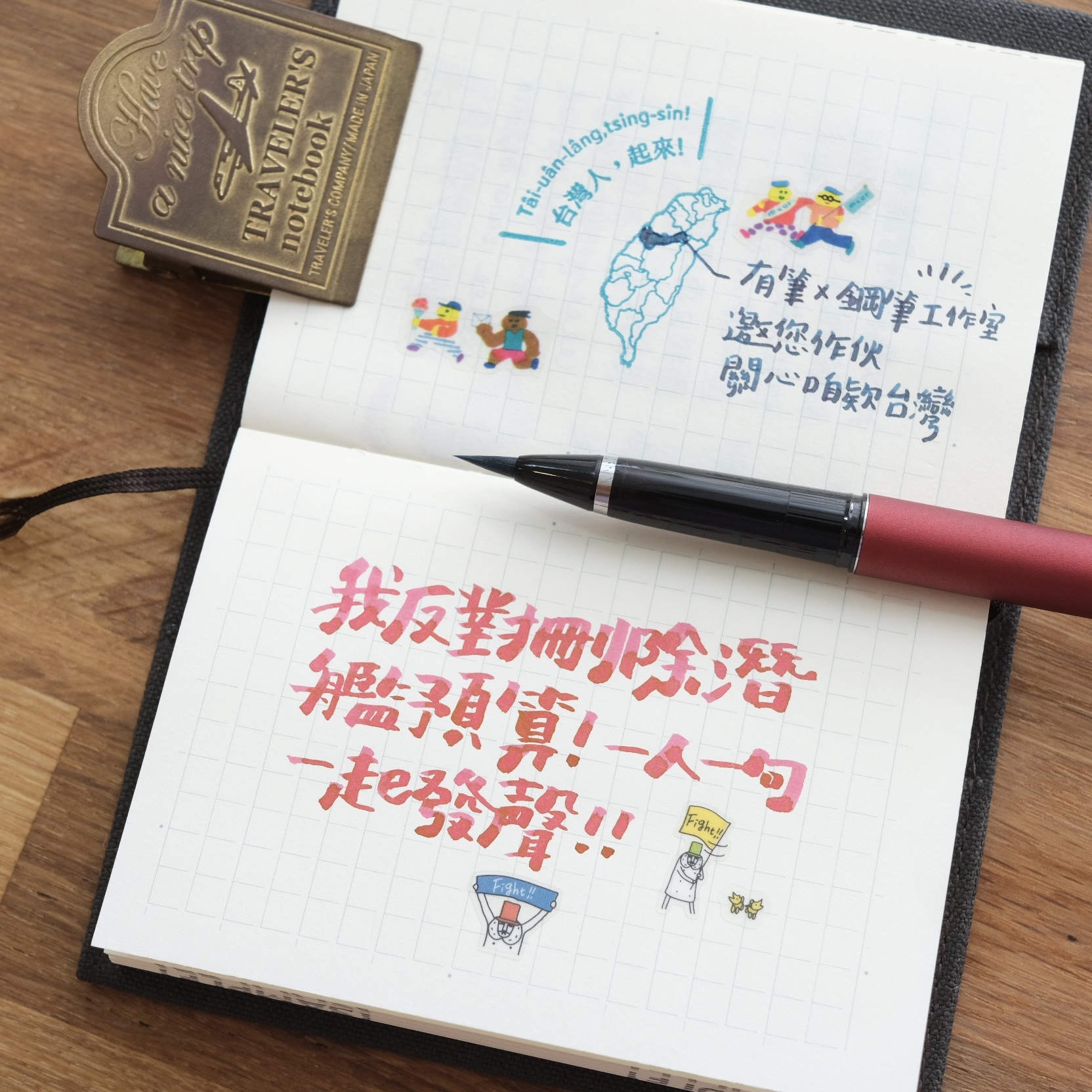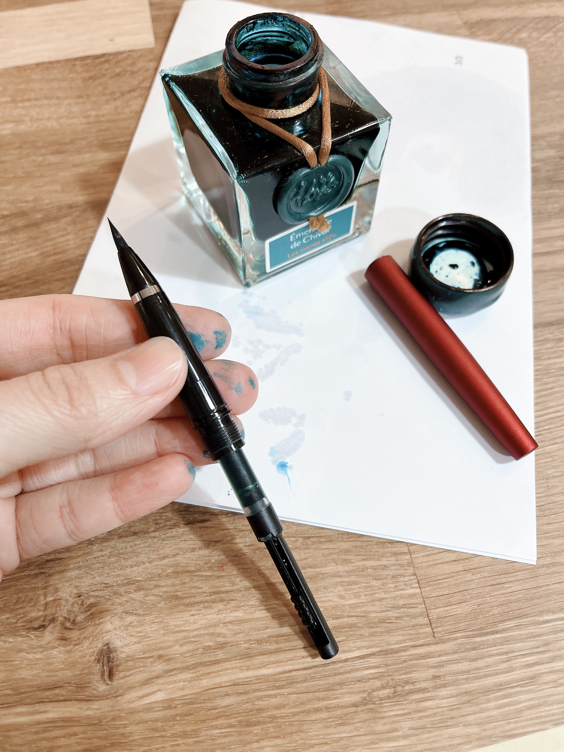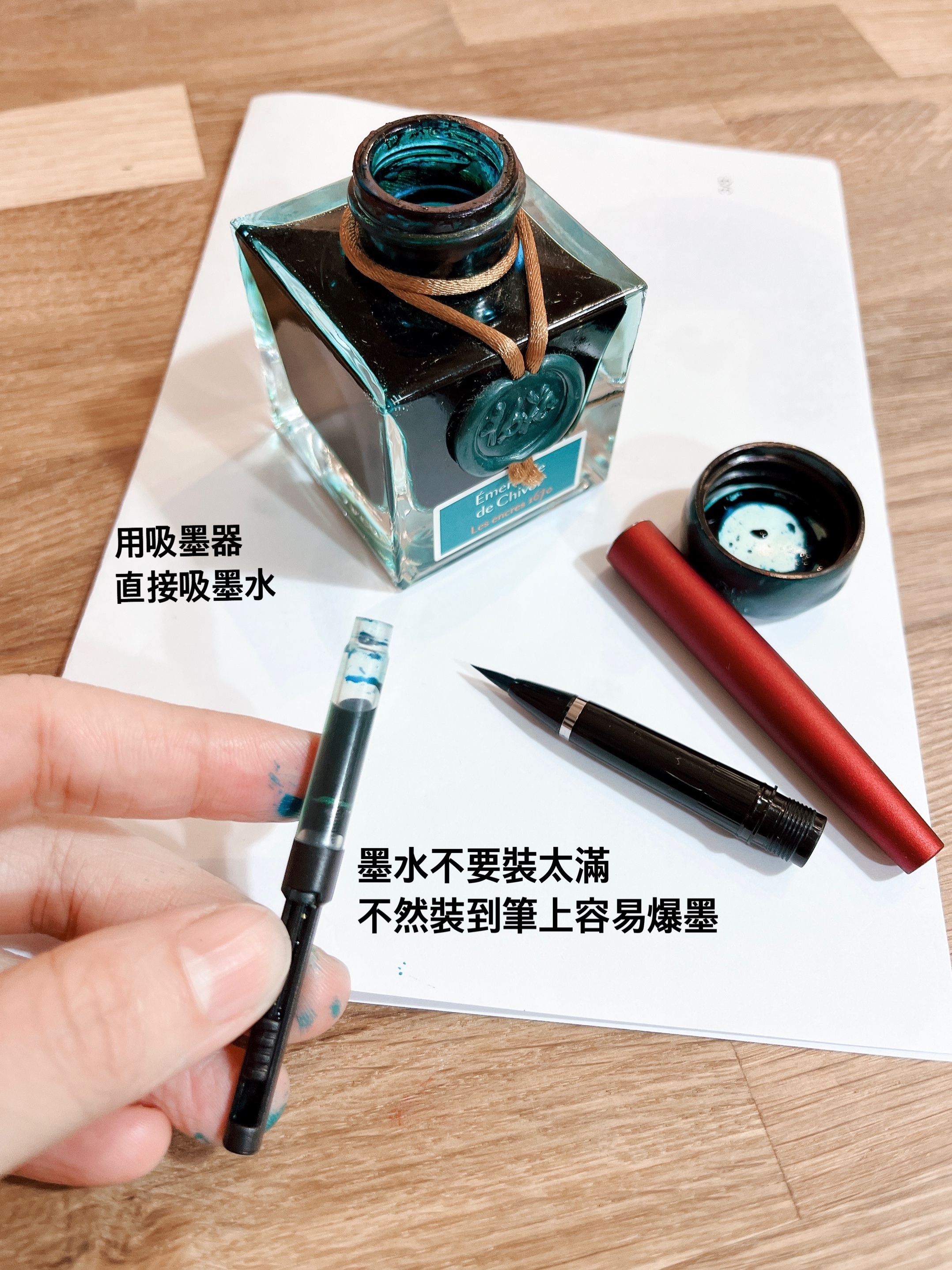 筆尖乾掉或是要更換墨水顏色時的清潔方式就像水彩一樣,有碰到墨水的地方 ‘ 毛筆尖 跟 吸墨器 ’ 使用自來水清洗即可,不要用熱水不要用清潔劑,一般自來水就可以了喔!