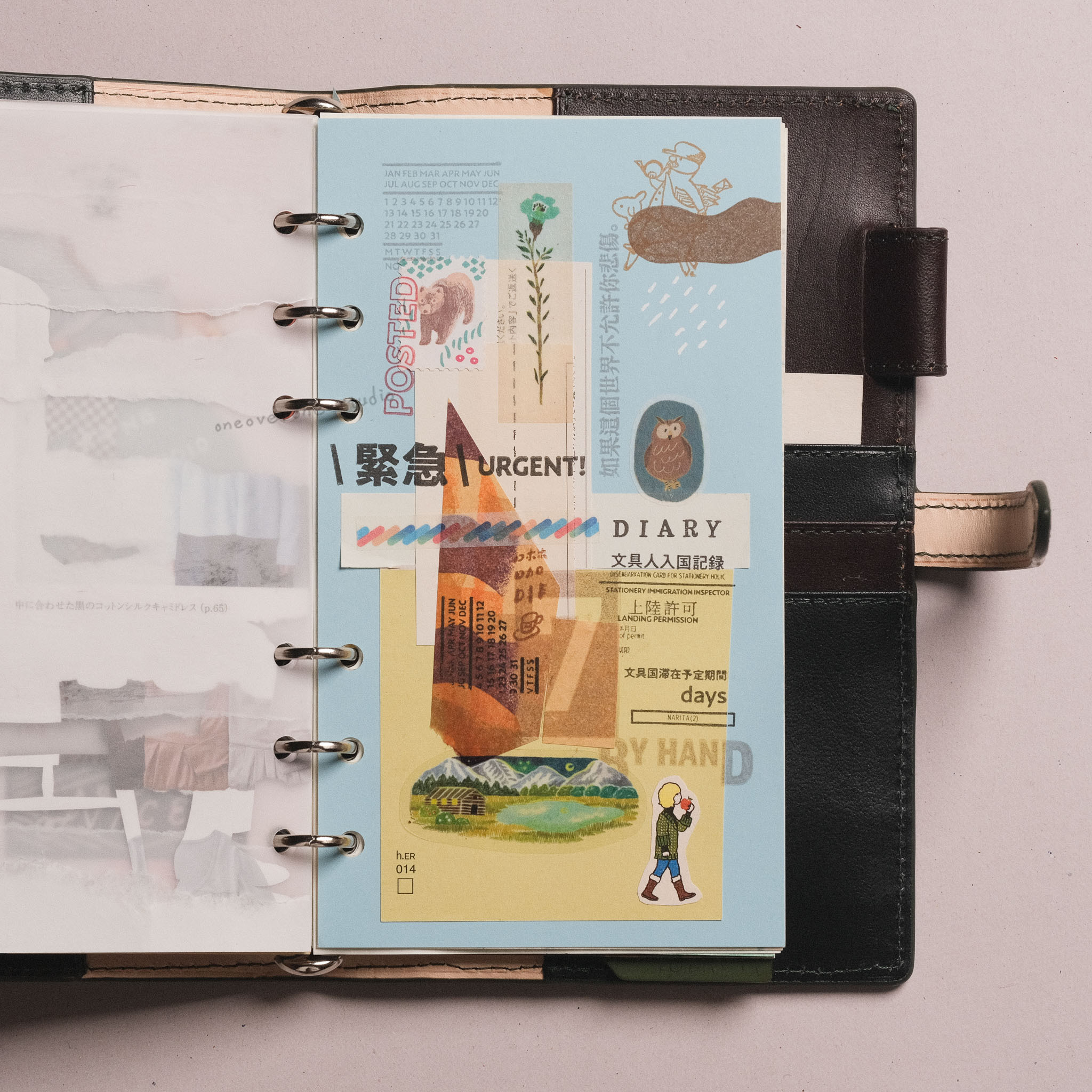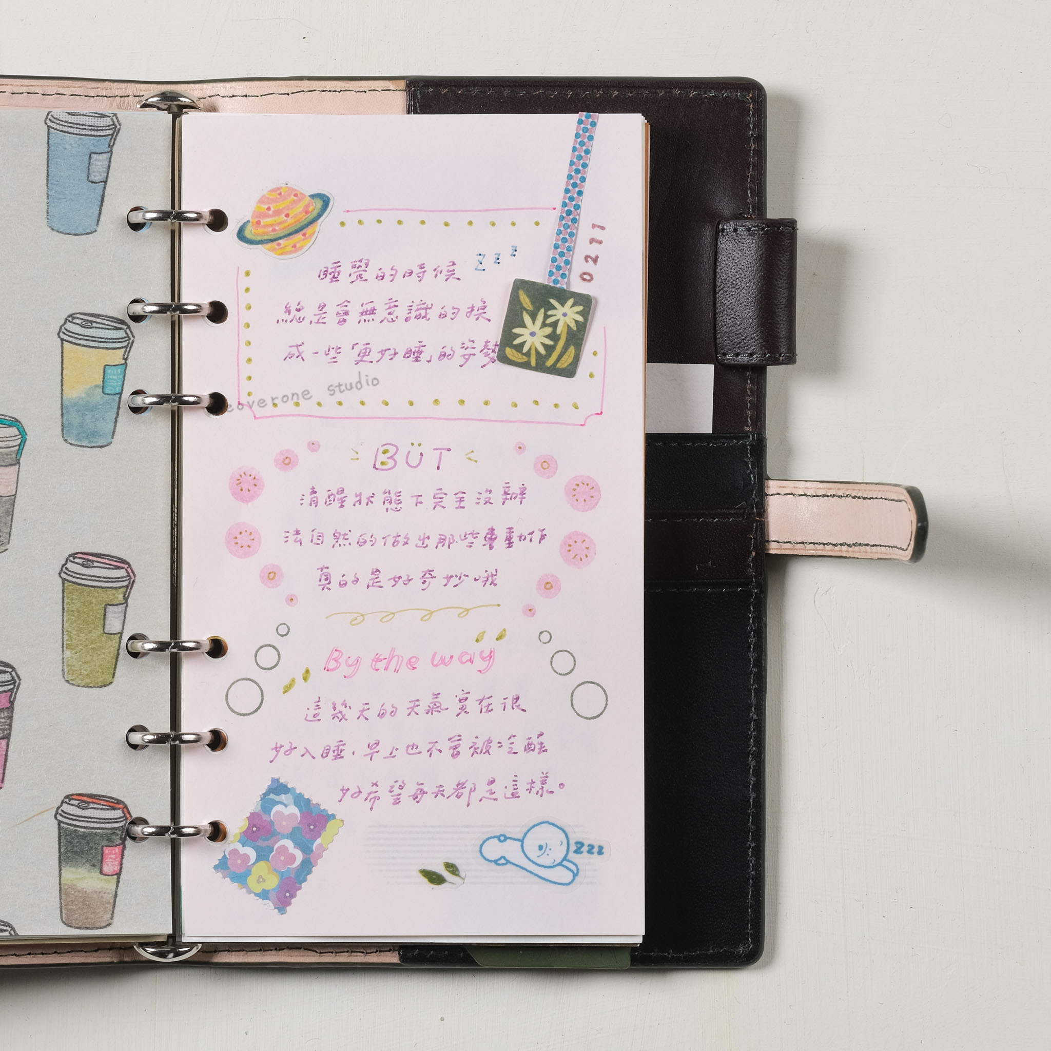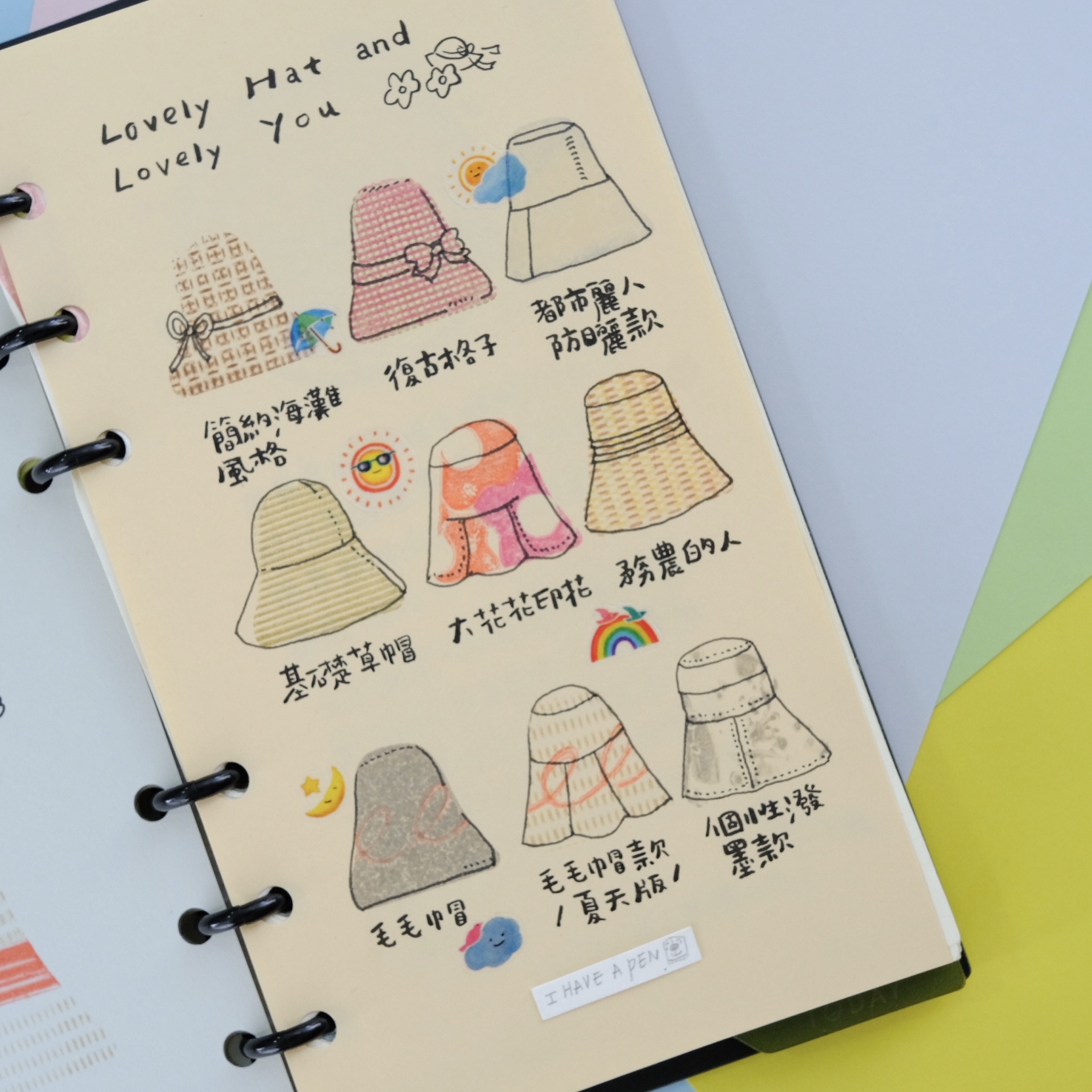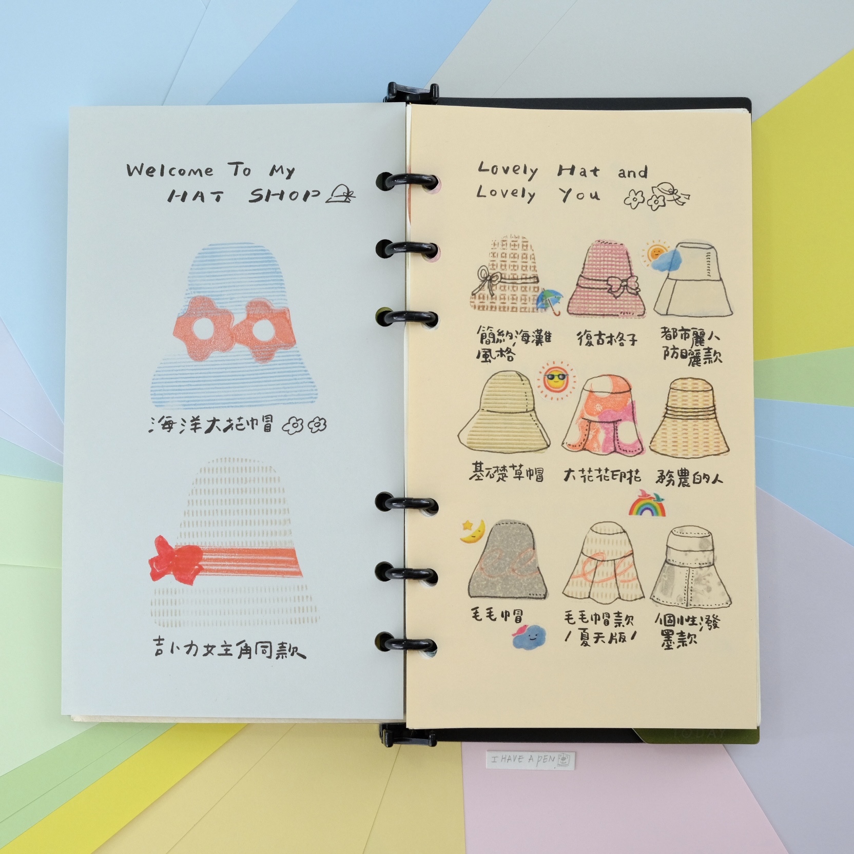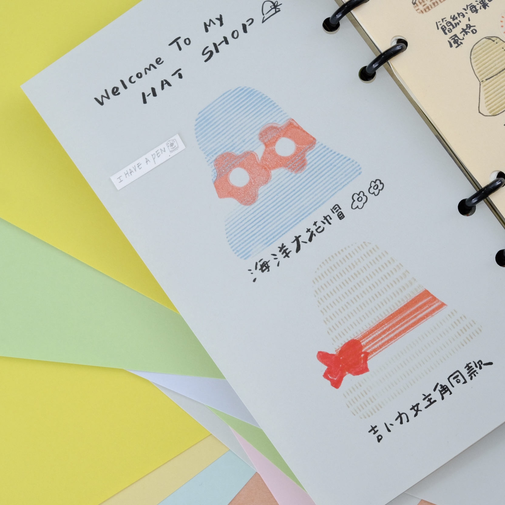 平常較少見的粉彩色紙,具有光滑而且消光的表面,雖然是比較薄的,但紙材硬挺,不會有廉價感,適應各種筆類跟適合蓋印,如需要用到太多水的水性筆或鋼筆,在某些顏色的紙會滲透,需要先測試過後再大面積使用。