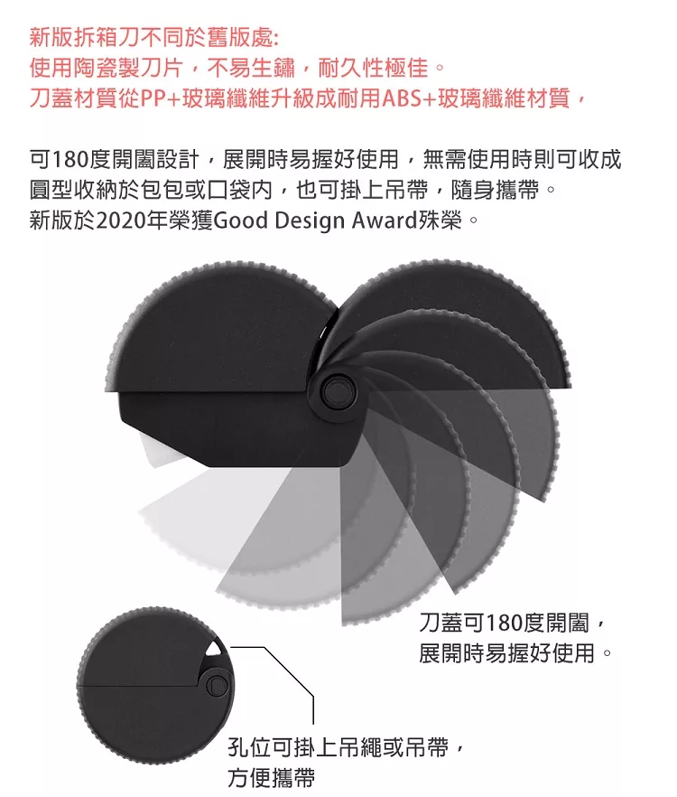 刀蓋材質從PP+玻璃纖維升級成耐用ABS+玻璃纖維材質,可180度開闔設計,展開時易握好使用,無需使用時則可收成圓型收納於包包或口袋內,