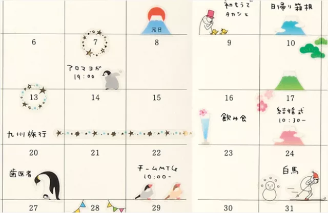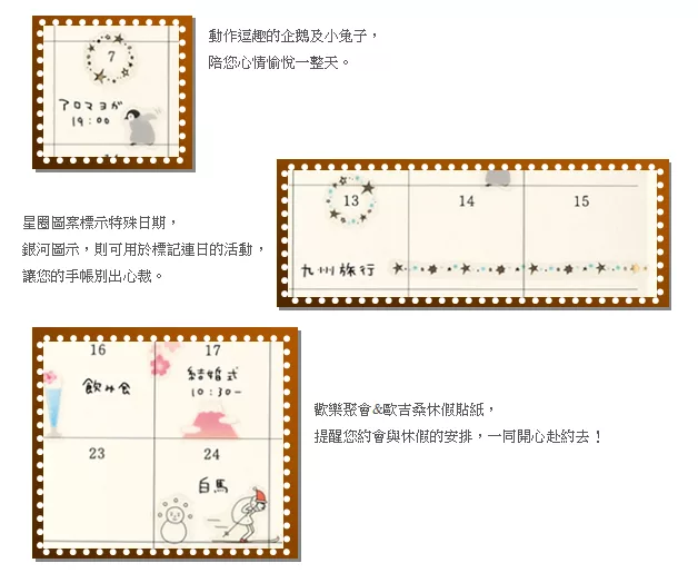 今年推出可愛的文鳥、企鵝、小兔子、富士山、星空、歡樂聚會以及歐吉桑休假中等新圖案,點綴您的手帳也豐富您的生活。