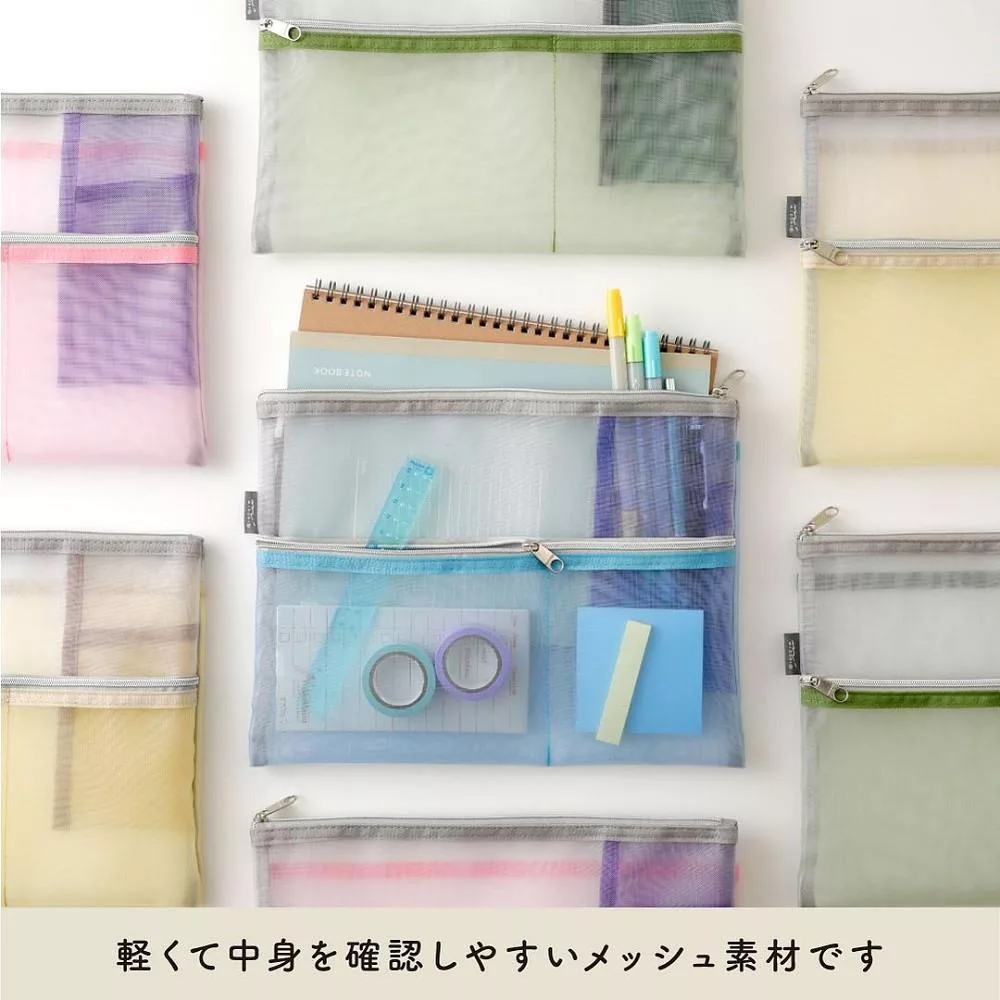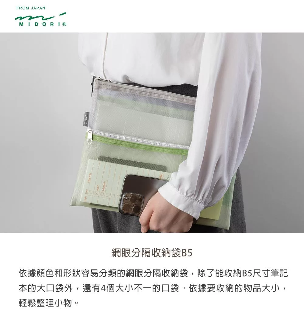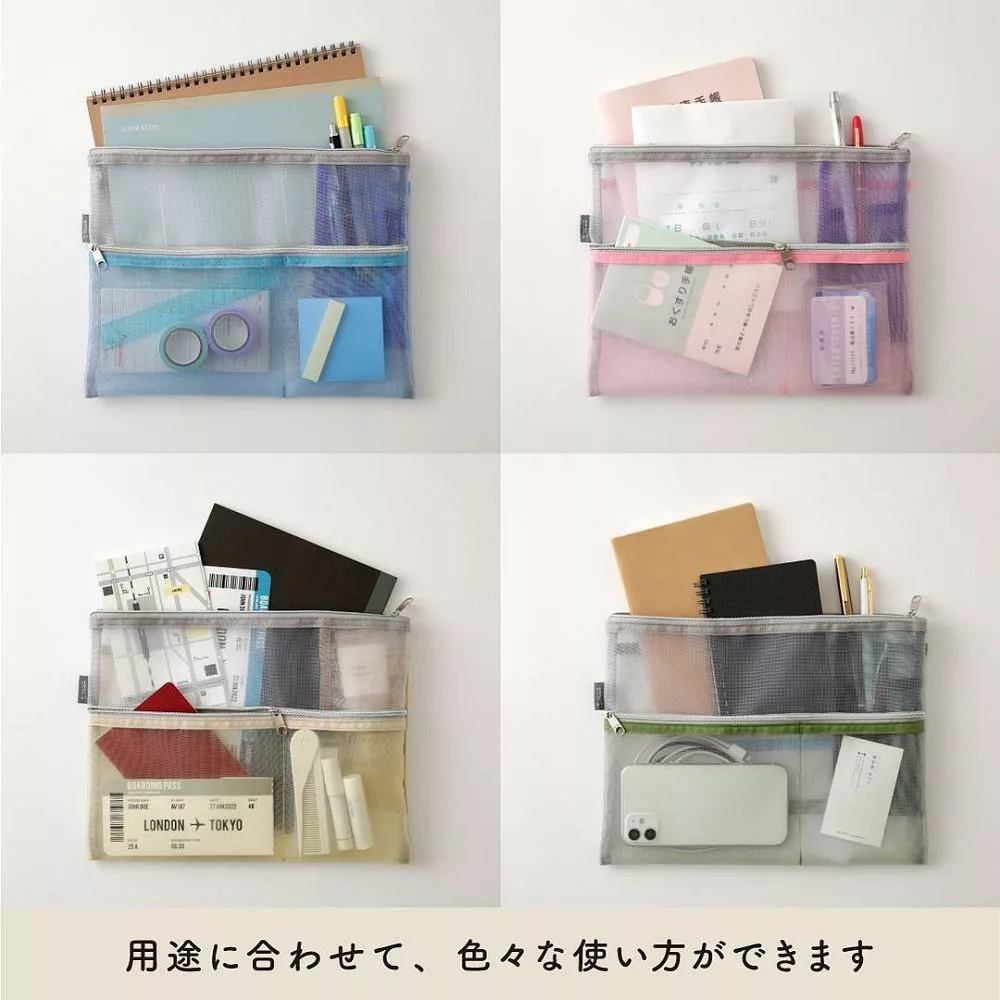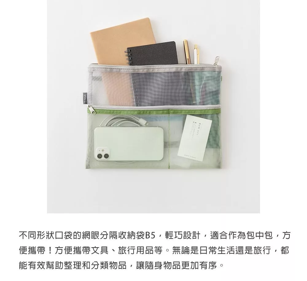 MIDORI網眼分隔收納袋的設計附有兩個顏色、大小不同的口袋夾層,可依收納物品的大小分類,細小物品也能輕鬆整理。口袋夾層採斜式開口,方便拿取小物,同時也可收納B6尺寸的筆記本/手帳,方便攜帶。