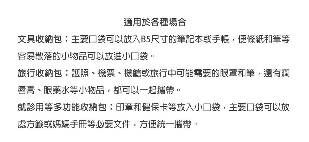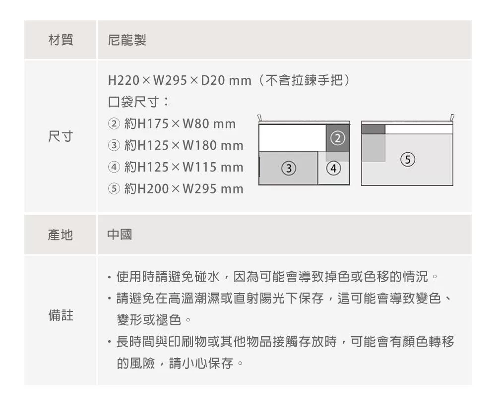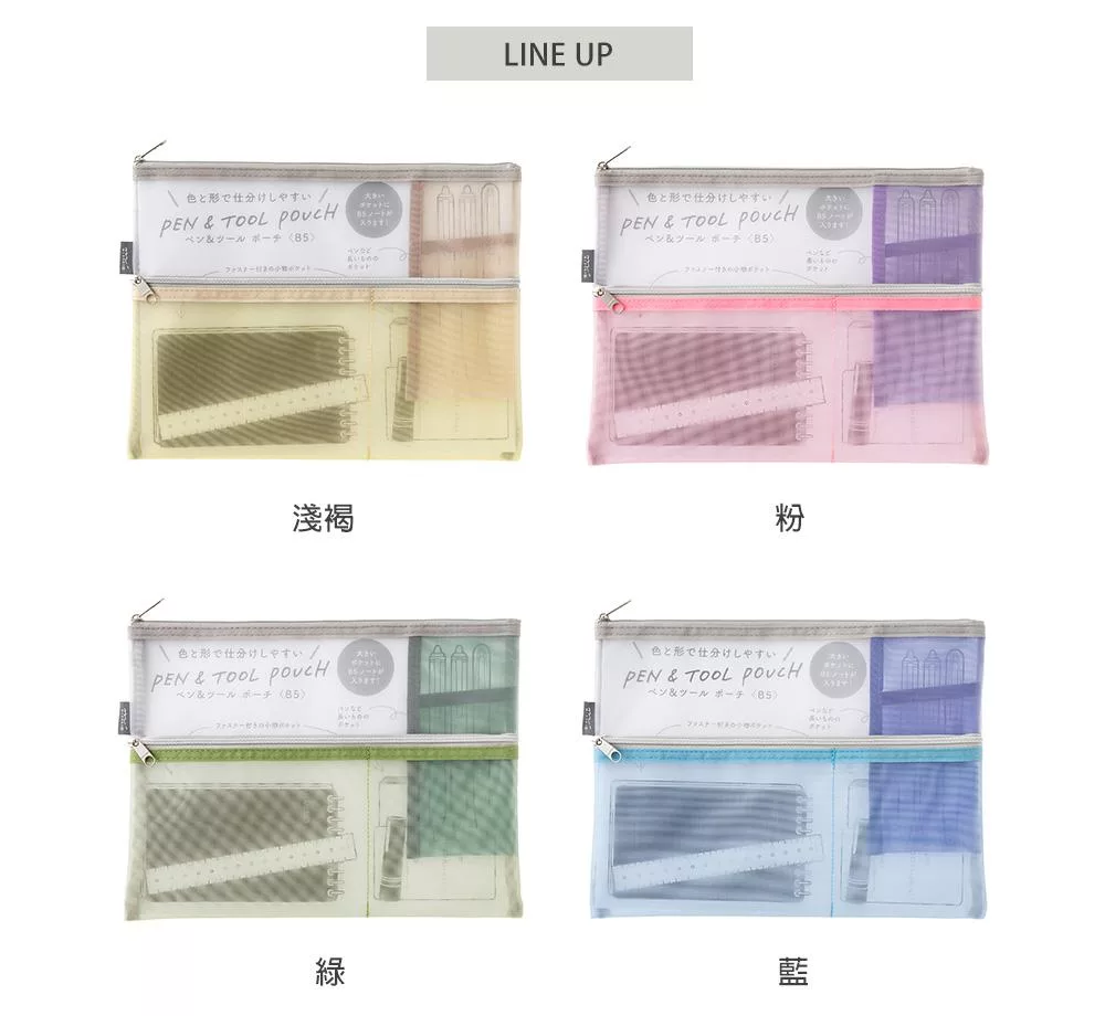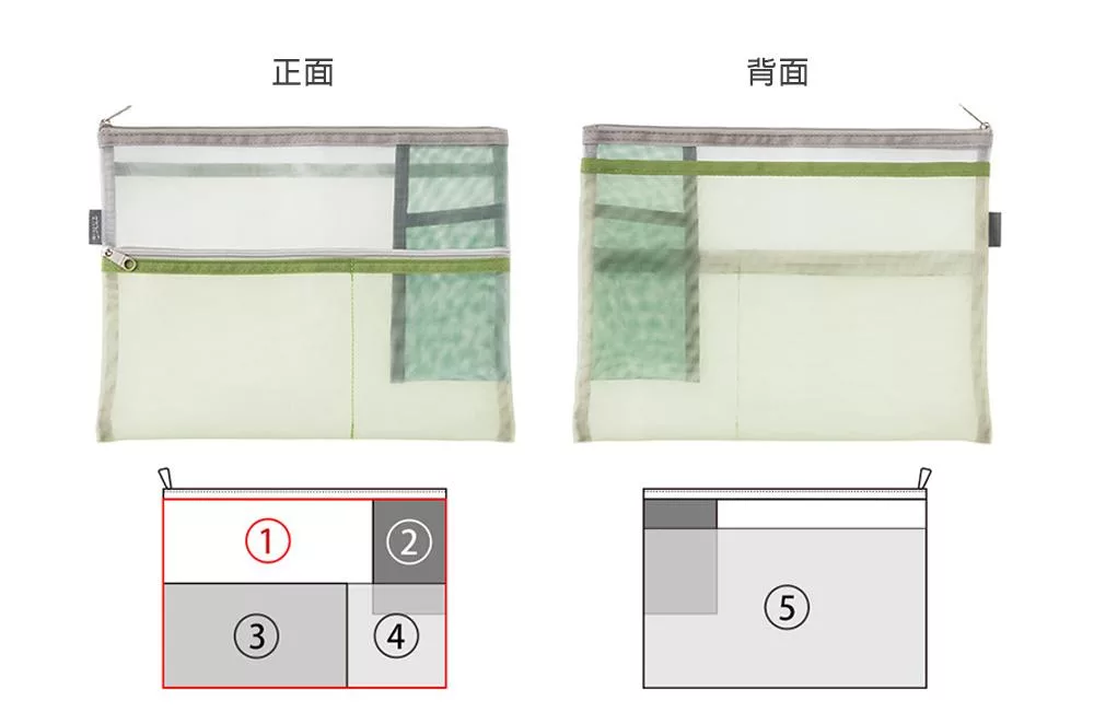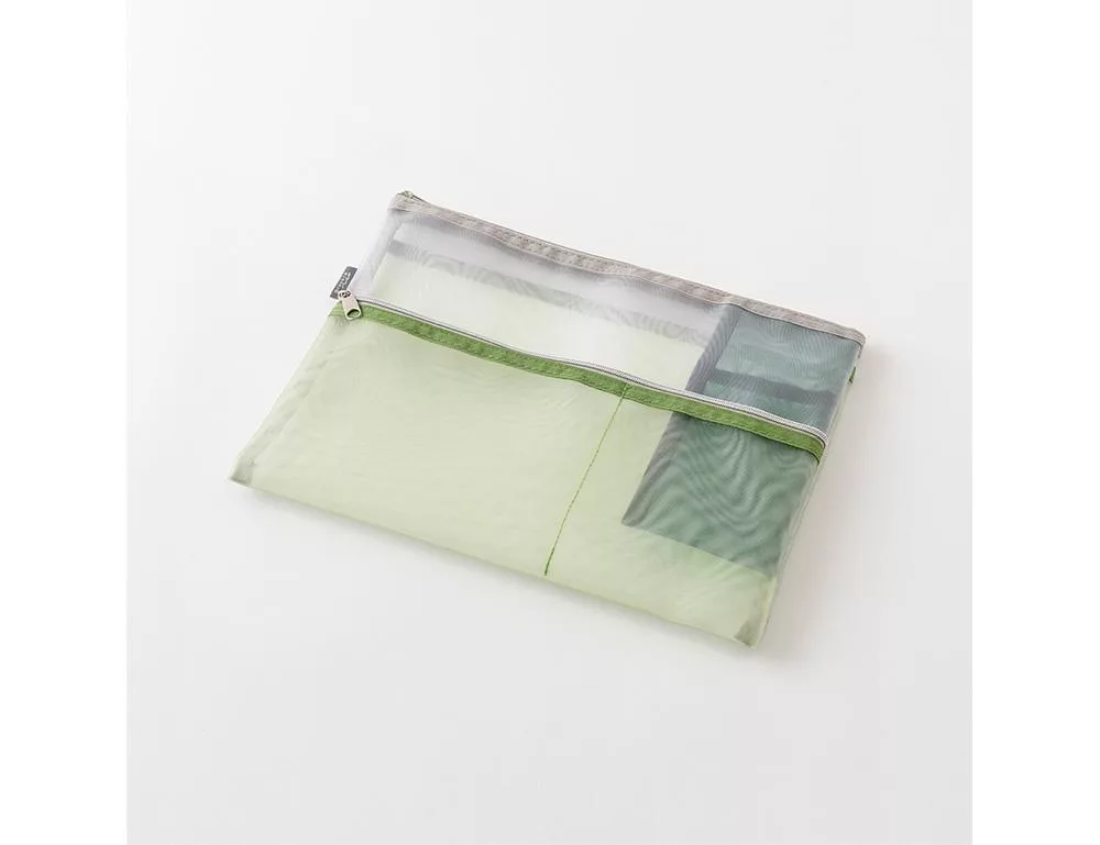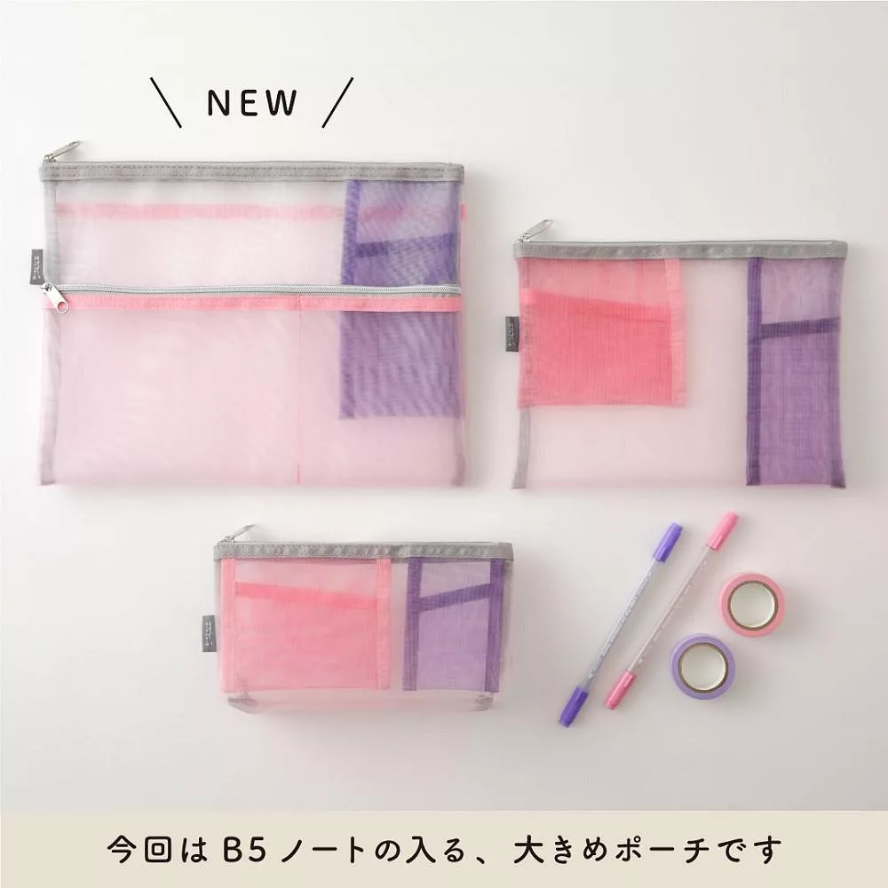 MIDORI網眼分隔收納袋的設計附有兩個顏色、大小不同的口袋夾層,可依收納物品的大小分類,細小物品也能輕鬆整理。口袋夾層採斜式開口,方便拿取小物,同時也可收納B6尺寸的筆記本/手帳,方便攜帶。