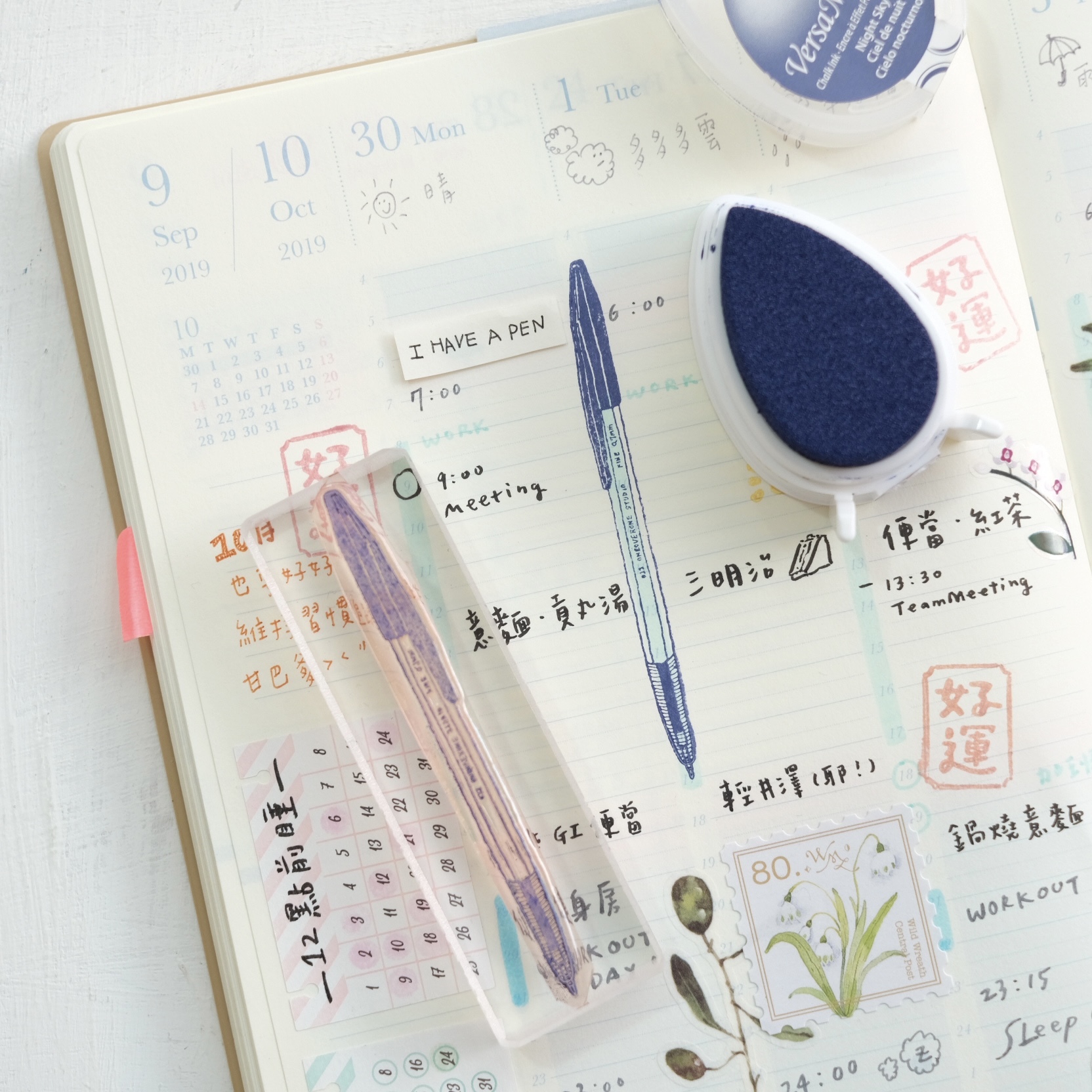 開蓋原子筆的膠版印章,老派的外型,雖為插畫風格但有刻意描繪出筆蓋的角度以及前端的半透明透造,