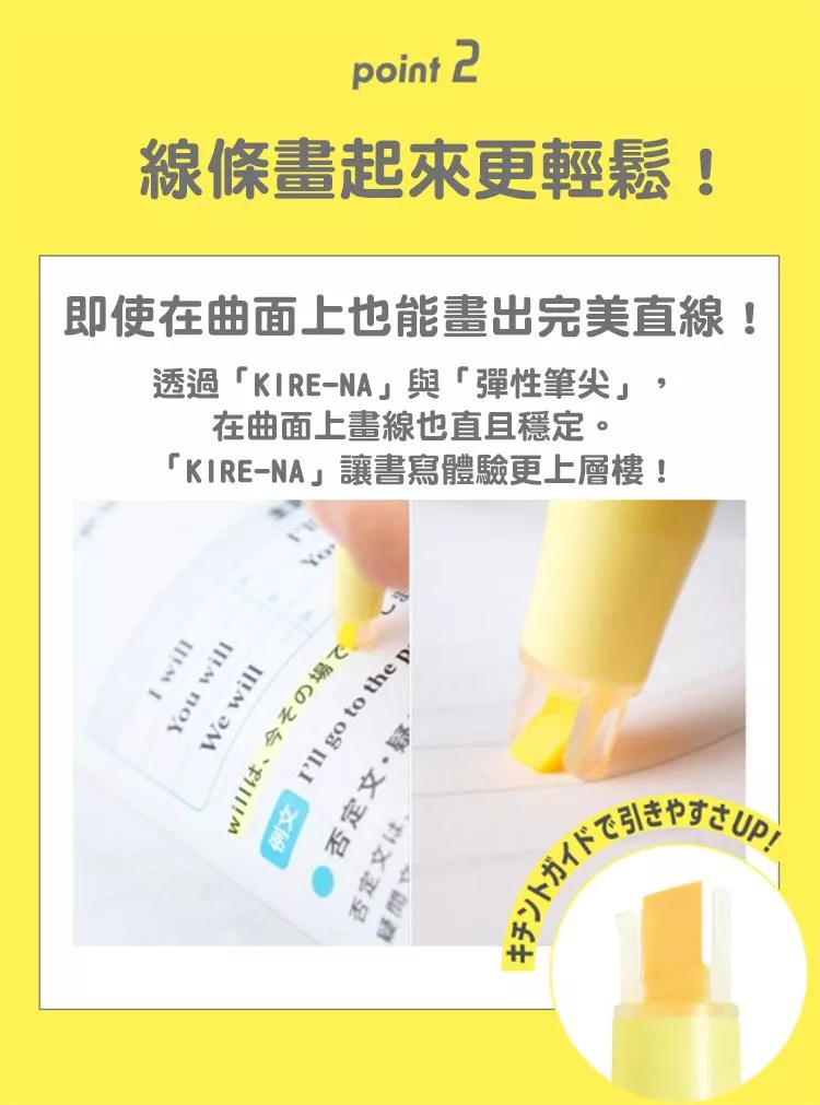 ①使用筆尖穩定裝置,盡線時更穩定也更容易畫出直線。特別適合在教科書的頁邊等曲面上書寫。