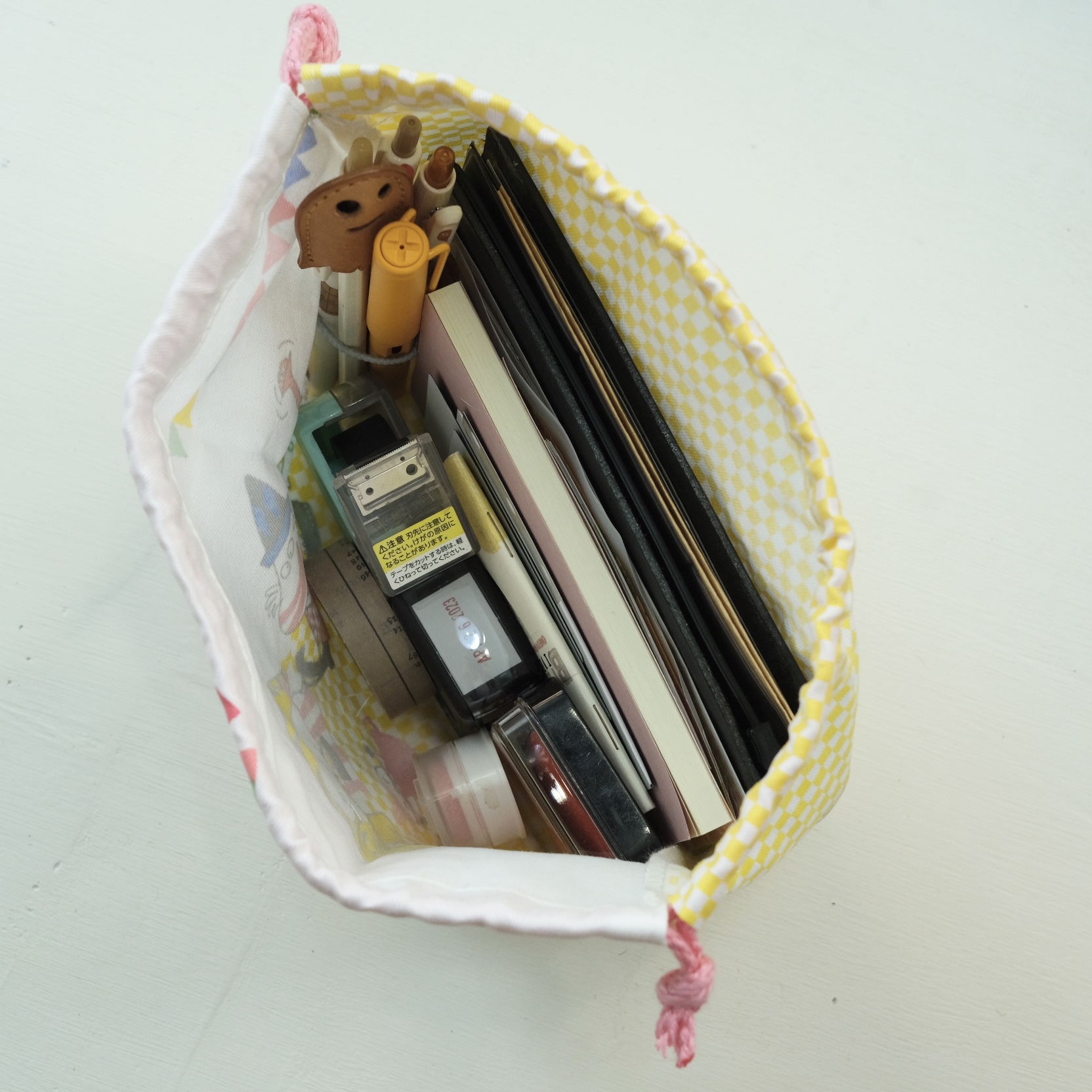 輕便的束口袋,不管是小旅行還是裝一些小物都很方便,筆記本可以收納最大到A5尺寸但會很剛好,B6以下的本子會比較剛好、